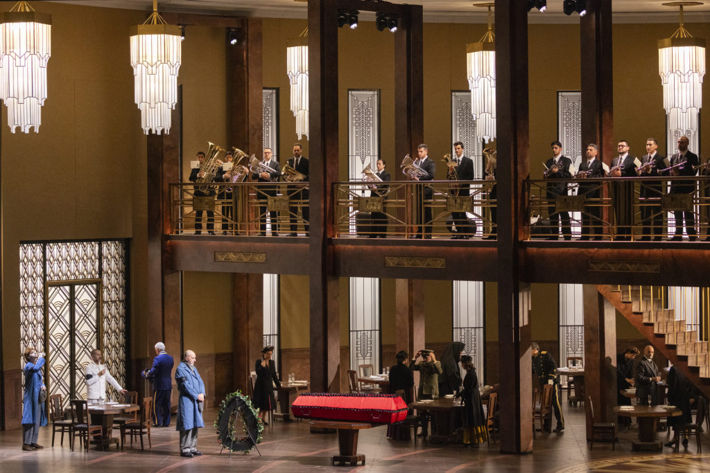 La dirección escénica de la producción milanesa, firmada por Vasily Barkhatov, optó por una lectura hiperrealista y saturada de signos, cuyo principio dominante parece ser el del horror vacui. La acción se traslada casi íntegramente a un restaurante, espacio único y omnipresente, continuamente atravesado por camareros, cocineros, clientes y por la figura insistente de un policía. La idea, en sí misma, podría dialogar con el pequeño mundo burgués del distrito de Mtsensk; sin embargo, su aplicación sistemática acaba por relajar lo que la música tensa, diluir lo que el drama concentra y confundir lo que en la partitura es de una claridad implacable.